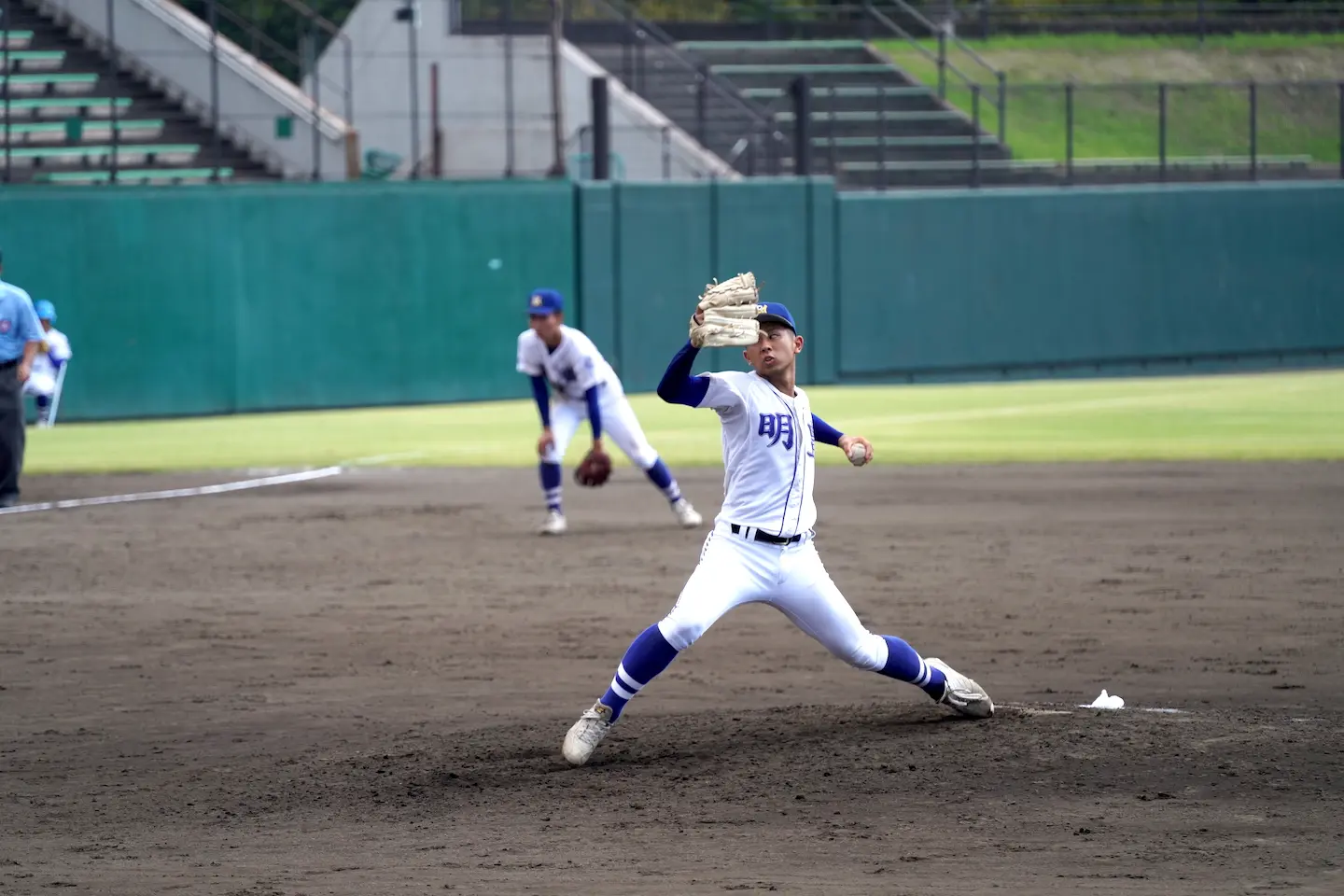 序盤から明豊の投手陣は制球に苦しみ、6回まで三者凡退が一度もない。攻撃では着実に得点を重ねてリードを広げたものの、4回に4本の長短打を浴びて1点差に迫られる。六回には同点とされ、嫌な流れが漂った。だが8回、5番川口琥太郎(1年)が左中間へ鋭い当たりを放ち、走者一掃のタイムリースリーベース。これで勝ち越した明豊は、最後まで粘る杵築を振り切った。