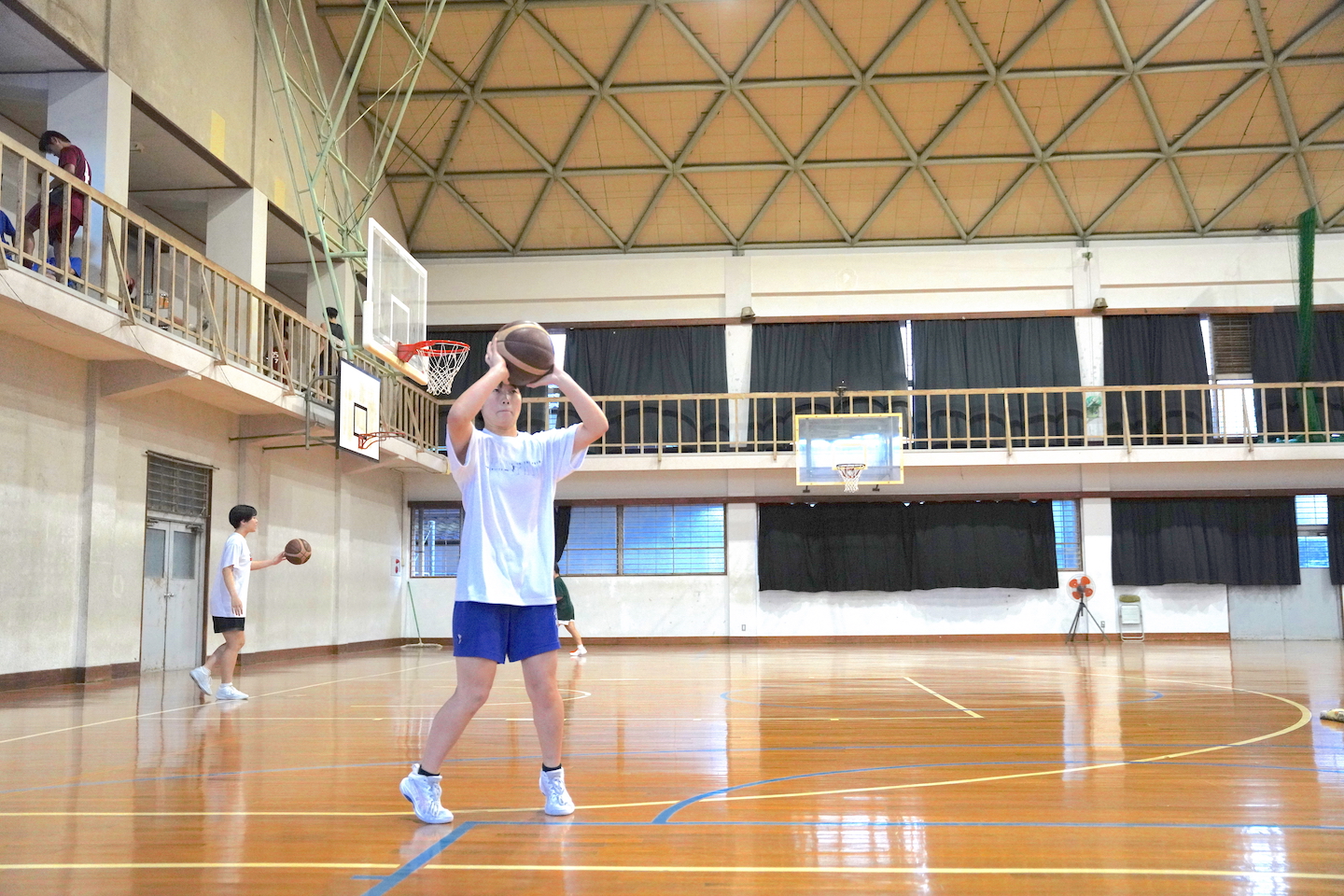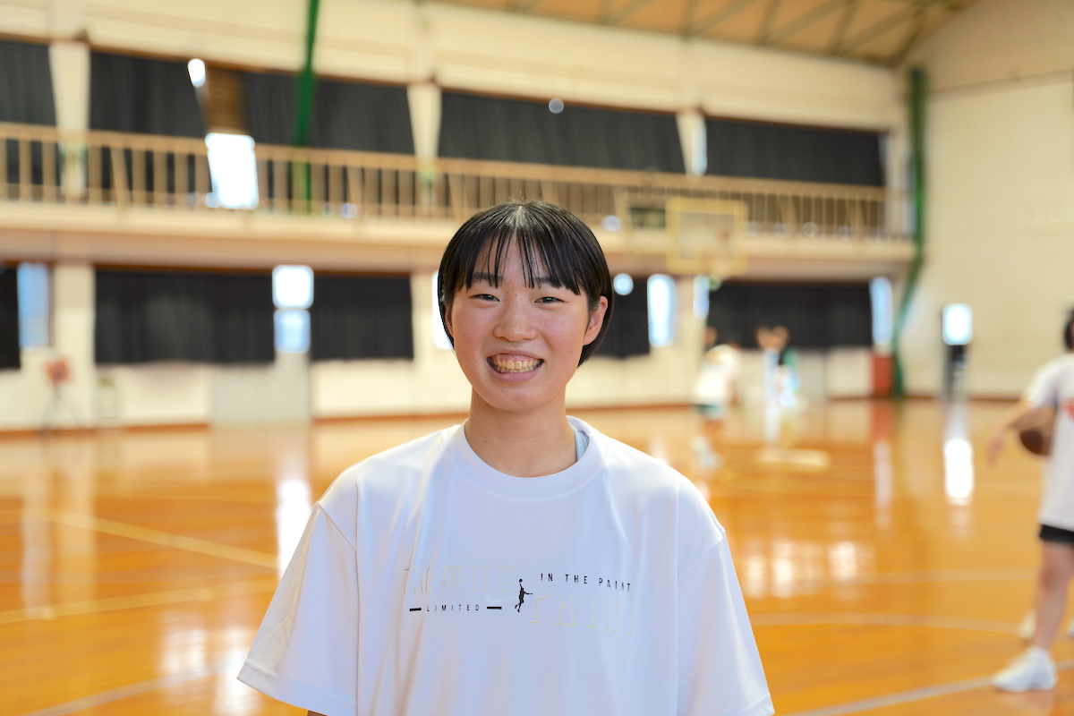 ゴール下で攻守に存在感を示す。ポジショニングの巧さとタイミングの良さでリバウンドを奪い、落ち着いた判断で次の一手へつなげる。最近ではアウトサイドからの得点パターンも増え、相手にとっては的を絞りにくい選手へと進化している。大学生との練習試合でも互角に渡り合えるまでに力をつけ、自ら「絶好調!」と笑顔を見せる。6月の県高校総体では「粘り強さで負けた」と悔しさを味わったが、今は「気持ちで負けない」と前を向く。リバウンドへの意識と得点への貪欲さを武器に、今大会は「1試合20点」をノルマに掲げる。チームの大黒柱として、勝利を引き寄せる。