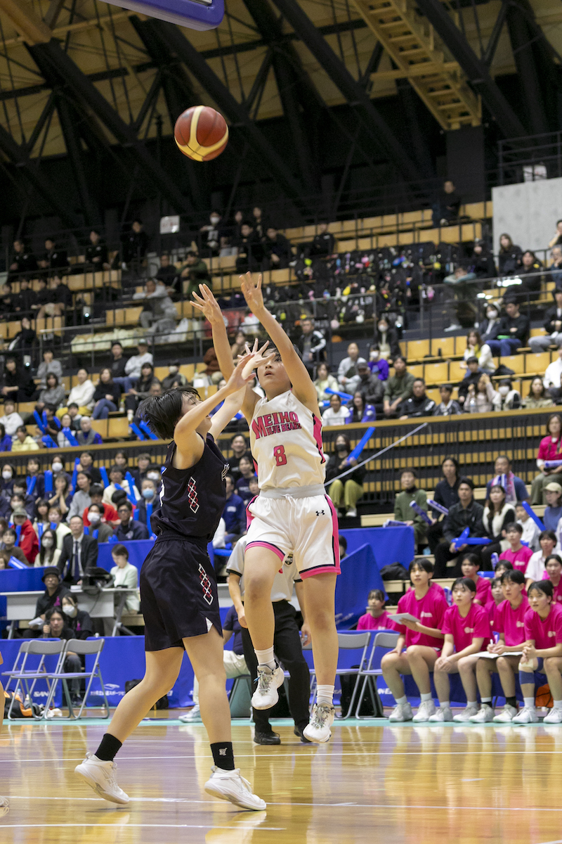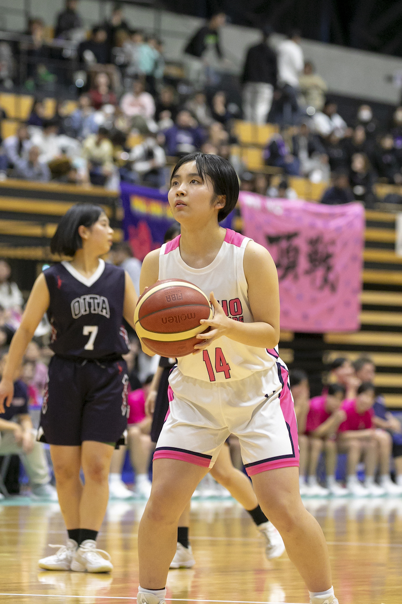 杉山真裕実監督は、対大分の過去1年分の映像を何度も見返し、相手のスリーツーゾーンに備えていた。だが、前半は外からのシュートが決まらず、平倉千春(3年)も厳しいフェイスガードに苦しむ。「練習通りにはいかなかった」と監督は振り返る。それでも、守備から流れをつくる「明豊の形」を貫いた。