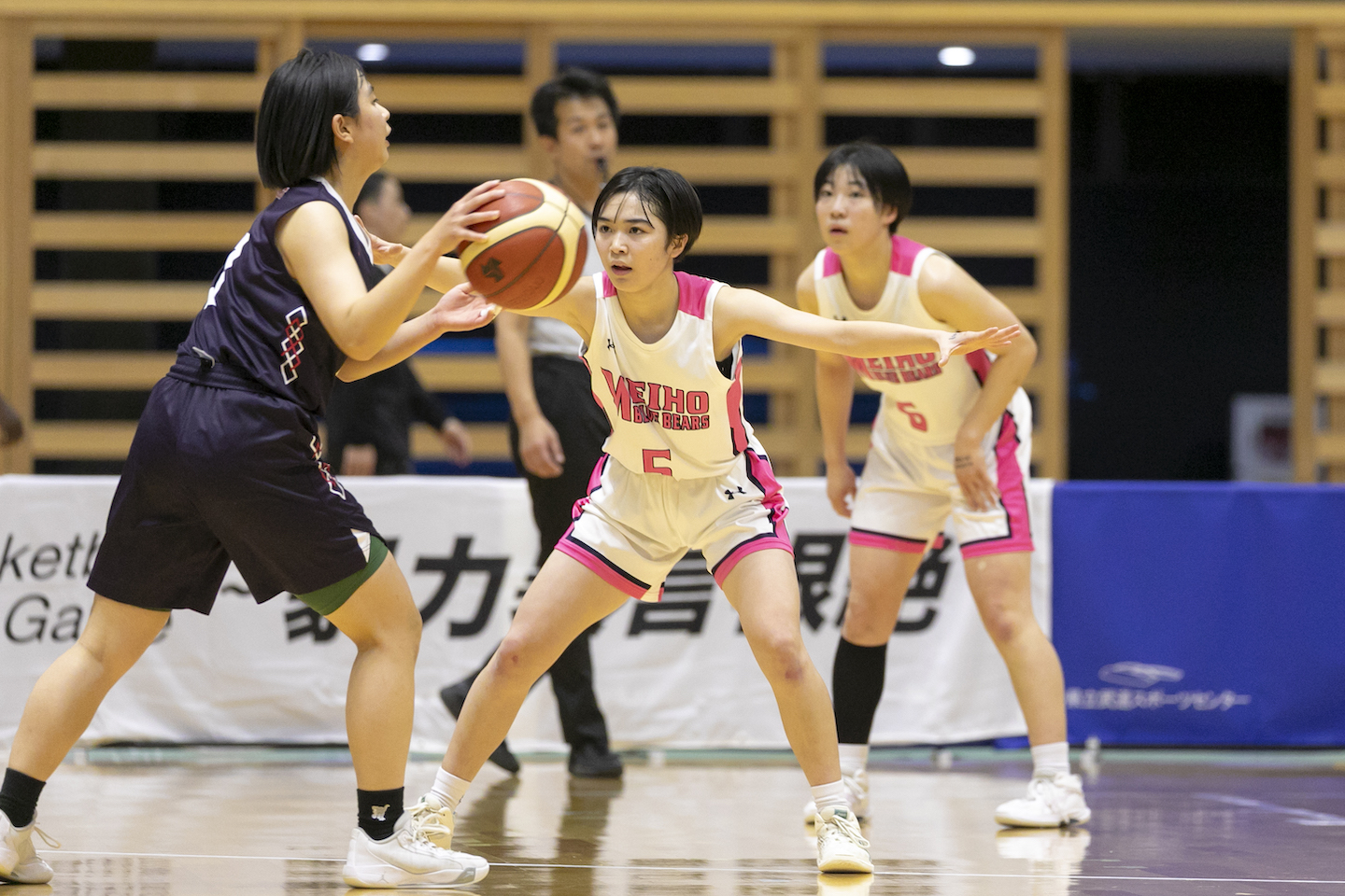 杉山真裕実監督は、対大分の過去1年分の映像を何度も見返し、相手のスリーツーゾーンに備えていた。だが、前半は外からのシュートが決まらず、平倉千春(3年)も厳しいフェイスガードに苦しむ。「練習通りにはいかなかった」と監督は振り返る。それでも、守備から流れをつくる「明豊の形」を貫いた。