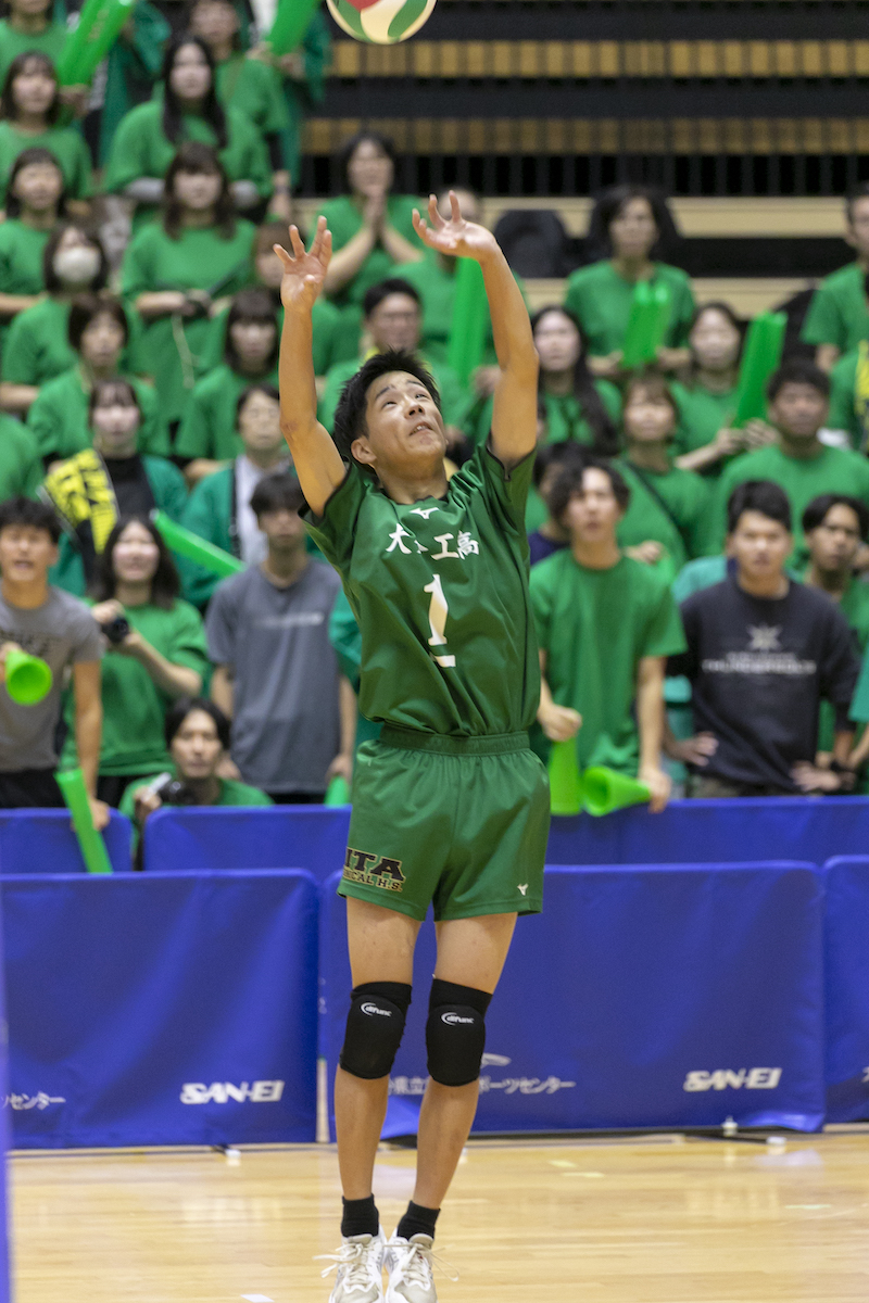しかし、ふたを開ければ、両者一歩も譲らぬ激闘となった。最初に流れをつかんだのは大分工業。攻撃面では県内屈指の技巧派である和間志苑(3年)や、圧倒的パワーで相手をねじ伏せるエースの今村望夢(2年)が躍動。1年生のポイントゲッター井野本勇斗、行村隆之介ものびのびとプレーし、得点を重ねた。相手のミスに助けられた部分もあったが、サーブレシーブも安定し、持ち味である粘り強さを存分に発揮した申し分のない内容だった。2セットを先取し、全国への切符に王手をかけた。