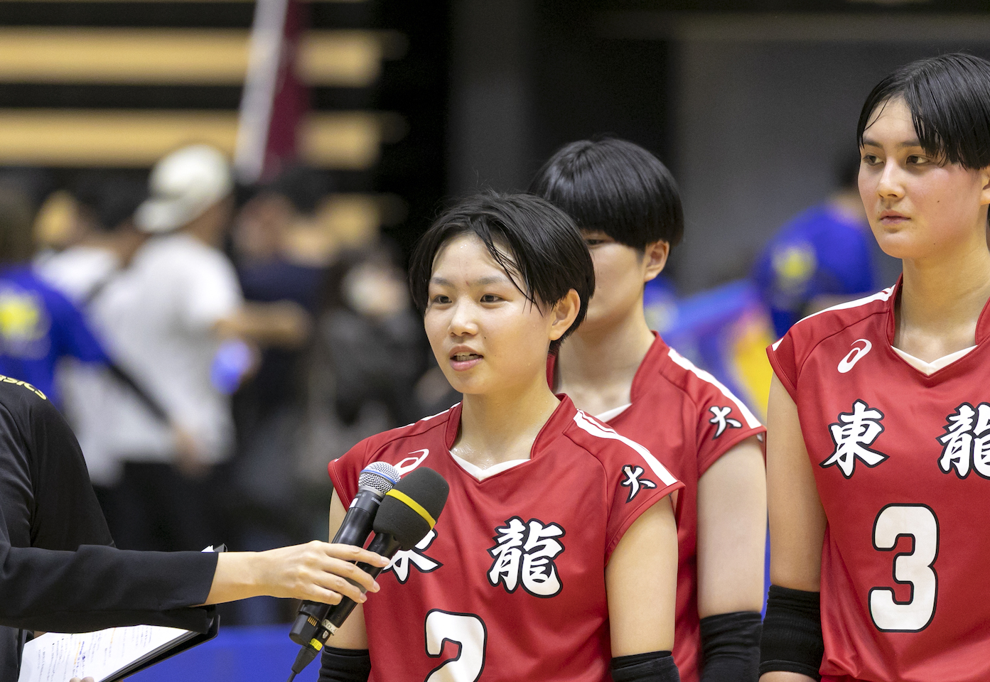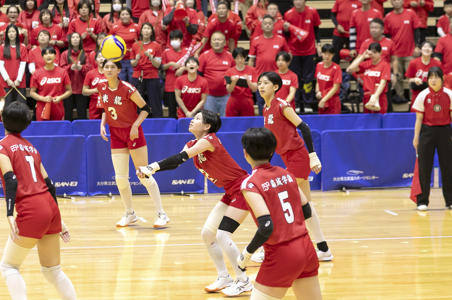 特筆すべきは攻撃力だけではない。レシーバーとしての能力も高く、守備専門のリベロに匹敵するレシーブ力を持つ。床際の難しいボールにも迷いなく飛び込み、体を投げ出してボールをつなぐ姿勢は、チームに安心感をもたらす。一本のレシーブが流れを変え、次の攻撃につながることを藤崎は知っている。だからこそ、派手さよりも確実性を選び、ボールを落とさないことに徹する。その献身的なプレーが後衛からリズムを整え、東九州龍谷の速い攻撃を根底から支えている。