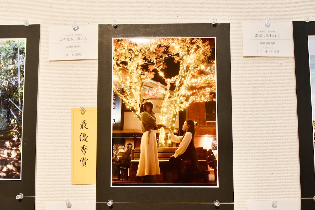 最優秀賞に輝いた松尾海音(大分国際情報3年)の「この先も、貴方と」は、場所や撮影時間の設定、構図のバランス、そして写真全体に流れるストーリー性が評価された。優秀賞の足立ひかり(鶴崎工業1年)の「導く者」は、部員をモデルに、スタジオ作りからポージングまでを自ら指示。人の表情やタイトルの意図を計画通りに表現する力が高く評価された。