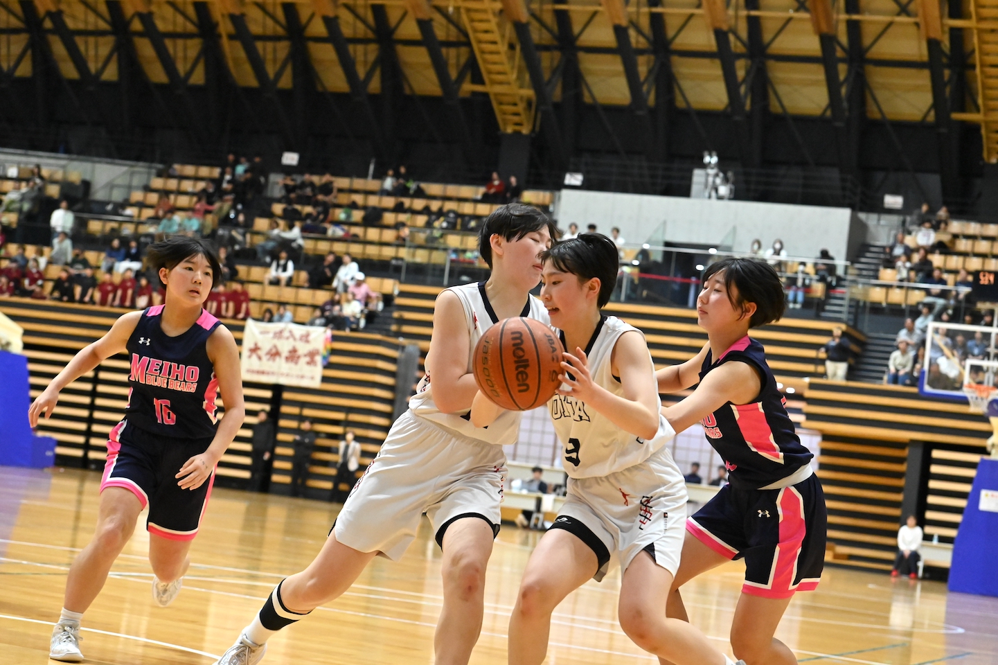 南九対抗の女子県予選決勝は圧巻の戦いぶりだった。大分は県高校新人大会覇者の明豊を相手に、前半を34―40と6点差のリードを許して折り返すと、第3クオーター(Q)で同点に追いつき、最終的に70―64で逆転勝ちした。中でも大分中学時代にエースで主将だった前田さくら(1年)が攻撃の起点となるなど、新戦力の充実ぶりがうかがえた。